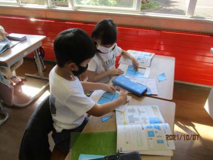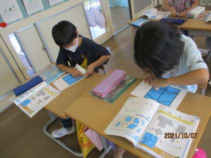 筆算の学習が終わり、新しく三角形と四角形についての学習をはじめました。今日は、教科書についている画用紙を切り取って形遊びをしました。