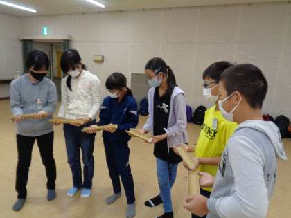 入所式を終え、室内で立山遊びリンピックの活動を行いました。一つ目の活動はパイプライン。ボールを落とさないように、相手のことを考えて取り組んでいました。
