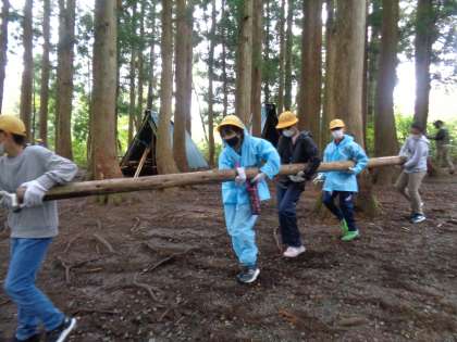 午後の活動は森の遊び場づくり。少雨の中あさぎりの森に行き、自分たちで遊び場を作りました。大きな丸太や竹、板を協力して運び、協力して縄でしばり、一人ではできないことも協力して乗り越えていたようです。