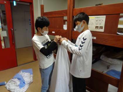 2日目、友達と協力してシーツの片づけや部屋の整頓を行いました。そして、朝の集いでレクリエーションも楽しみ、ご飯を食べて元気をチャージ。