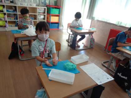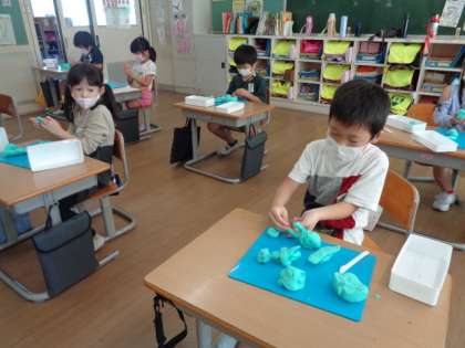 【1年生】ごちそうパーティーの練習 公開日 2021/10/07 更新日 2021/10/07 1年生 油粘土でいろいろなごちそう作りを練習しました。おすしやカップケーキ、ピザ、だんご等おいしそうでした。来週はカラフルな紙粘土で作ります。子供たちはとても楽しみにしているようです。