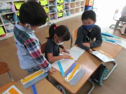【1年生】算数 公開日 2021/10/07 更新日 2021/10/07 1年生 今日から繰り上がりのある「たしざん」の学習が始まりました。子供たちは、どうやって計算したらよいかブロックを使って一生懸命考えていました。