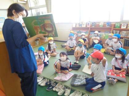 【1年生】読み聞かせ 公開日 2021/10/08 更新日 2021/10/08 1年生 図書室の先生に、「ジオジオのかんむり」を読んでいただきました。誰からも恐れられる王様ライオンのお話でした。読書の秋です。たくさんの本と出会ってほしいです。
