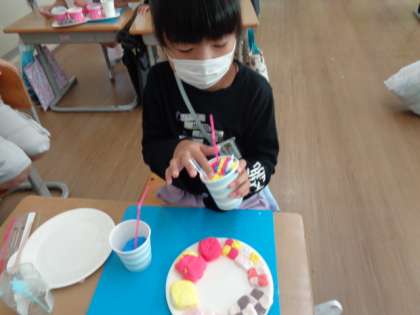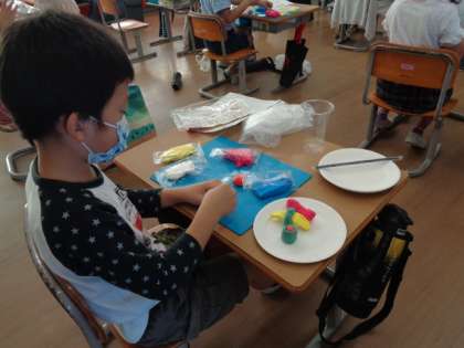 子供たちが楽しみにしていた「ごちそうパーティーへようこそ」をしました。フワフワの感触や、混色やマーブル・ねじり模様作りなど、紙粘土に夢中になって、思い思いにごちそう作りを楽しんでいました。保護者の皆様、紙皿等のたくさんの準備をありがとうございました。