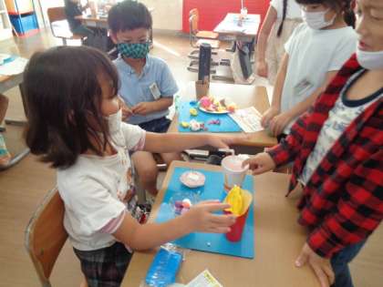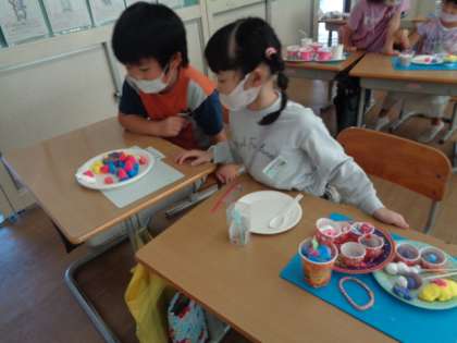 自分のごちそうをペアになって紹介し合いました。「おいしそう!」「上手!」と友達のすてきなごちそうに目を輝かせていました。