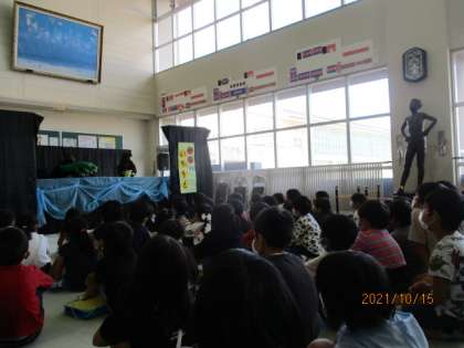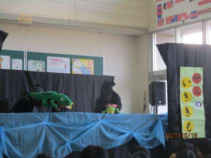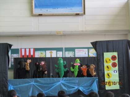 読書フェスティバルの最後は、こでまりの会の方々による人形劇「サルのいきぎも」を観劇しました。