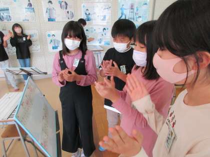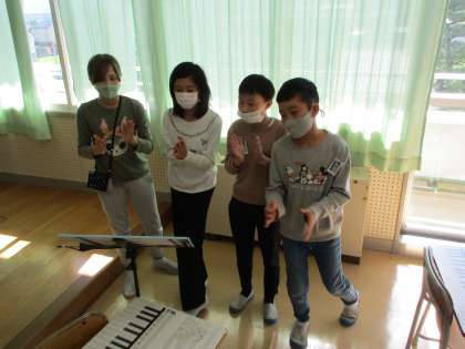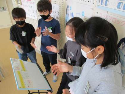 音楽の授業で、グループで「おまつり」アンサンブルを楽しみました。自分たちでいろいろなリズムを組み合わせながら、リズムの重なりのおもしろさを味わいました。