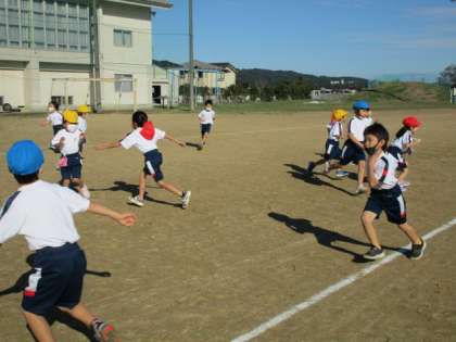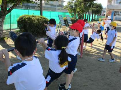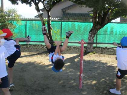 今日は晴れたので、外で鉄棒とおにあそびをしました。