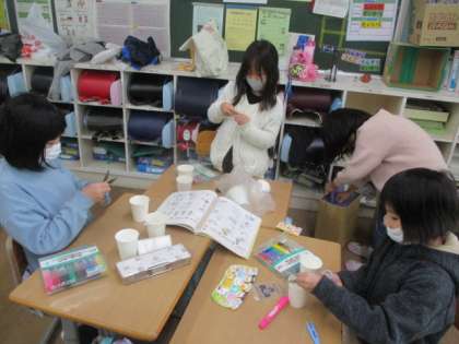 グループに分かれ、集めた材料でうごくおもちゃを作っています。