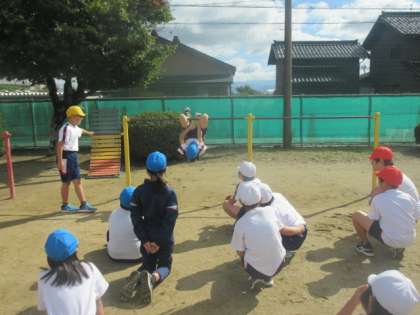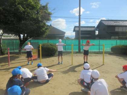 鉄棒では、自分たちができる技を組み合わせて発表会をしました。