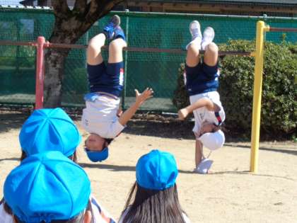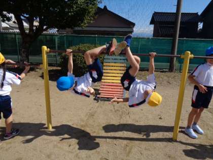 今日は「20秒つかまらないチャレンジ鬼ごっこ」と「けいどろ鬼」、鉄棒では「ぶたの丸焼きじゃんけん」と「こうもりじゃんけん」「地球周り」を練習しました。少し肌寒い日でしたが、太陽の下元気に体を動かしました。