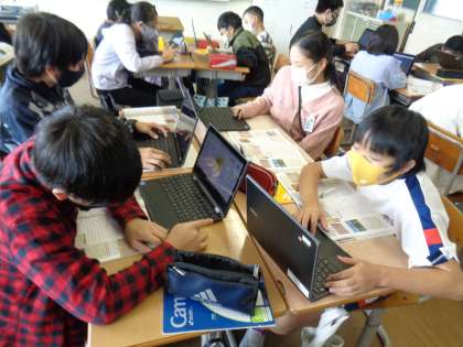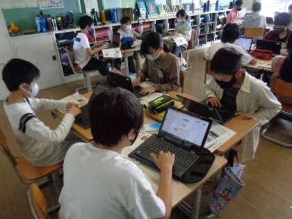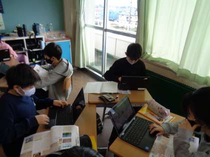 社会科の学習では、織田信長と豊臣秀吉のした取組の中で代表的なものについて、その効果を考えました。Jamboardを使うことで、多くの意見を出し合い、交流につながっています。