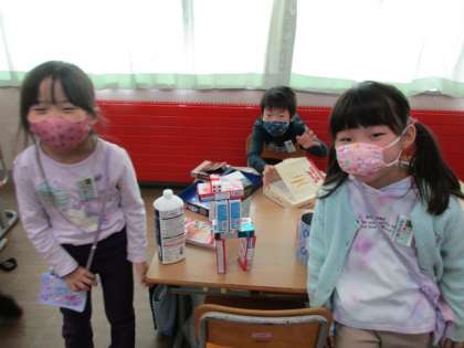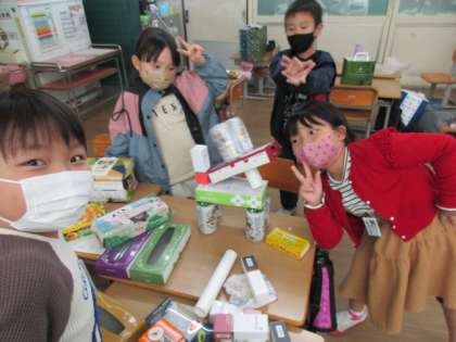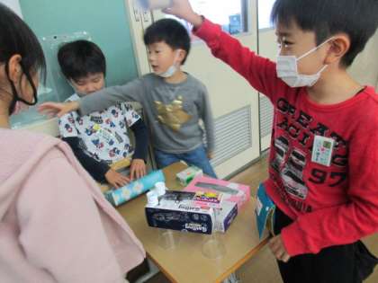 今日の「かたちあそび」の学習では、生き物や乗り物、遊具を作りました。いろいろな形の組み合わせ方を工夫して、上手につくっていました。