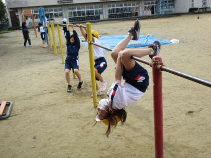 【1年生】体育 公開日 2021/10/27 更新日 2021/10/27 1年生 今日の体育は、「おにあそび」と「鉄棒」をしました。「おにあそび」では、けいどろをしました。「鉄棒」では、地球まわり、こしかけ等の技に挑戦しました。地球まわりは、少しずつこつをつかめてきたようで、今日初めてできたという子がたくさんいました。
