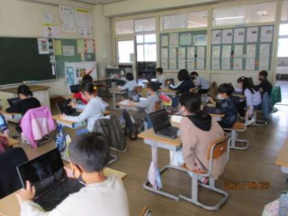 前回音楽の時間に行った山のポルカ音楽発表会の動画をタブレットで一人一人確認しました。
