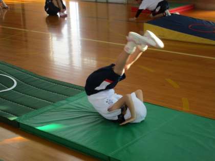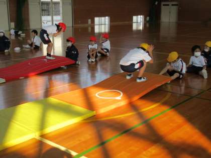 今日も、前転や後転に繰り返し挑戦しました。後転は、遠くにおしりを着くのがポイントです!ぜひご家庭でも練習してみてください。