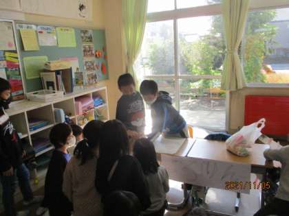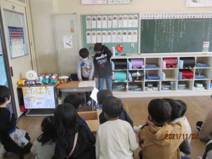 ワクワクおもちゃランドのリハーサルをしました。明日の学習参観に向けて前半と後半に分かれて友達の作ったおもちゃで遊びました。