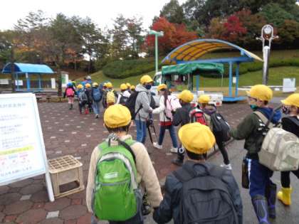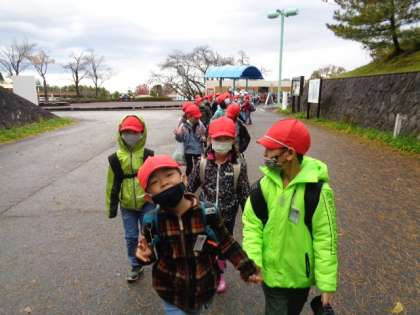 太閤山ランドに到着すると、グループごとに1・2年生のペアで手を繋いでこどもみらい館へ向かいます。2年生が1年生をしっかりとサポートしてくれて、とても頼もしかったです。