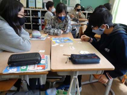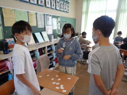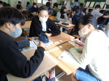 今日の外国語の授業では、今日まで学習してきた食材がどの栄養素のグループに入るのか伝える表現を学習しました。カードをめくり、食材に合わせて伝え合う活動では、時々悩みながらも、自信をもって伝え合う姿が多く見られました。