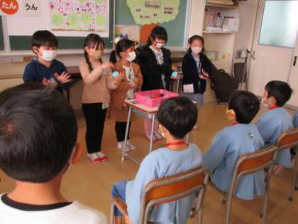 がっきであそぼうコーナーでは、カスタネットの演奏に挑戦してもらいました。カスタネットの持ち方が分からない子のそばに行き、優しく教える姿がほほ笑ましかったです。せりふもばっちりでした!