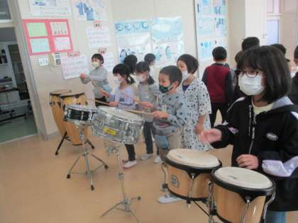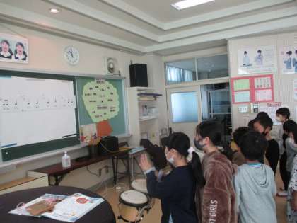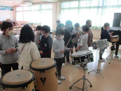 作ったリズムをグループごとに発表しました。色々な楽器にふれて心地よいリズム、演奏しやすいリズム、難しいリズムを確認しました。