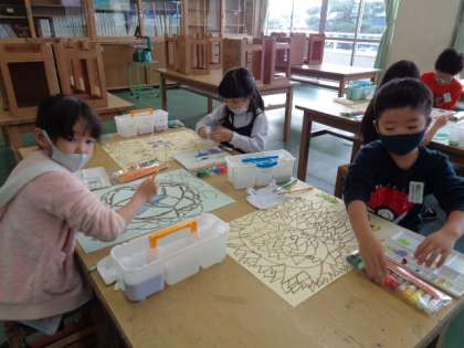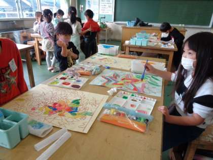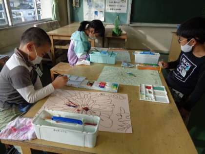 初めて図工室で「世界に一つだけの花」の彩色を行いました。絵の具の水の量や色の合わせ方を工夫して塗っていくと、どんどん花がカラフルに生き生き輝いてきました。来週も続きを行います。