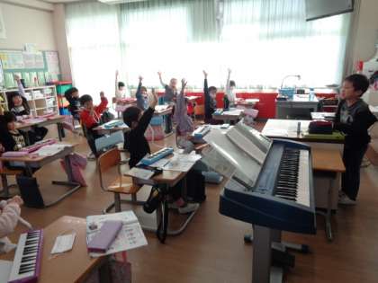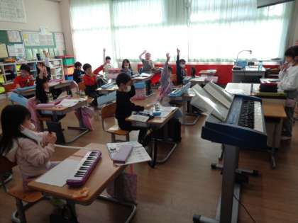 【1年生】音楽 公開日 2021/11/18 更新日 2021/11/18 1年生 「たんたんたんうん」のリズムで旋律を作り、みんなでまねっこする学習をしました。音を聞いて「ドミソ」と当てるのは難しいですが、音感が鍛えられます。子供たちは楽しそうにまねっこをしていました。