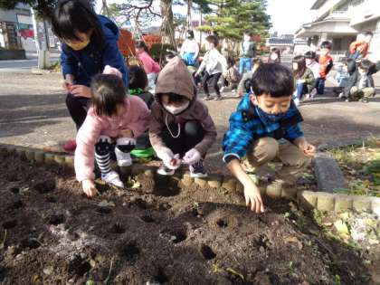 野菜や植物の栽培に詳しいW先生に教わりながら、花壇に球根を植えました。花が咲く頃には、子供たちは2年生。可愛い花が咲くのが楽しみです。