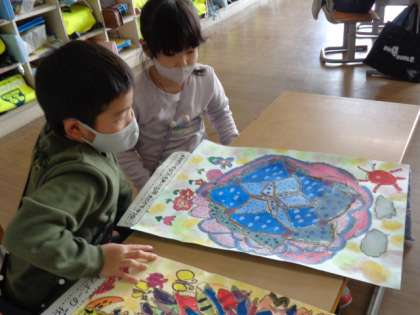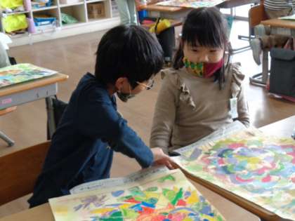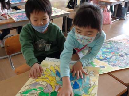 作品に題名を付けて、ペアになって鑑賞し合いました。「この色がいいね」「花の形がおもしろいね」とお互いの作品の素敵なところを伝え合いました。