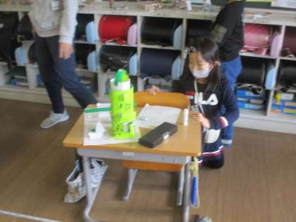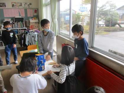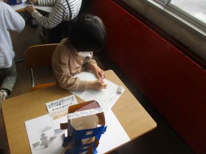 カッターを始めて使って作り上げた作品である「まどからこんにちは」の鑑賞会を行いました。友達の作品を見て「すごーい」「まどの形がおもしろい」と感想を述べていました。