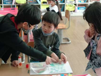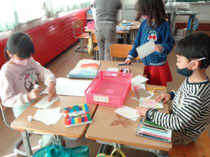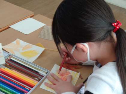 でこぼこを紙にこすり出して写しとる学習をしました。見本でやり方を見せると「うわあ、きれい!」「やってみたい!」と子供たちは意欲満々!教室の様々なものをカラフルな色鉛筆で写しとって楽しみました。家にもおもしろいでこぼこが発見できるかもしれません。ぜひ遊んでみてくださいね。