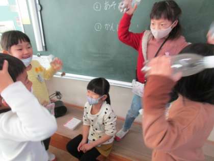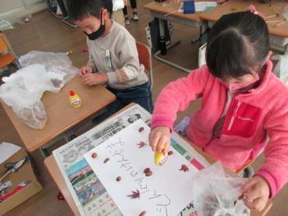【1年生】あきのおもちゃ作り 公開日 2021/12/03 更新日 2021/12/03 1年生 月曜から始まった秋のおもちゃ作り。おもちゃもだんだん完成してしたので、どんな風に遊ぶお店にするか、グループの友達と話し合いました。楽しいお店になりそうです。