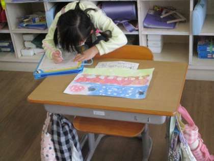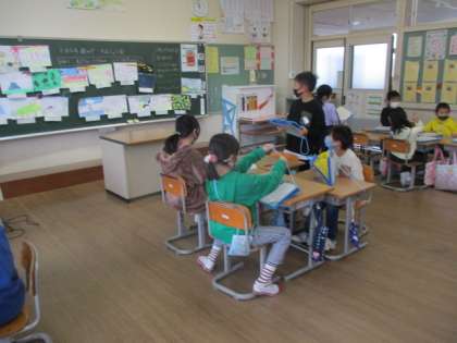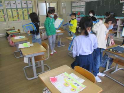 図工の学習で、とろとろ絵の具の鑑賞会をしました。友達の作品のすてきなところやいいところ、まねしたいところをたくさん見つけてグループごとに発表しました。