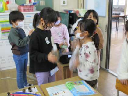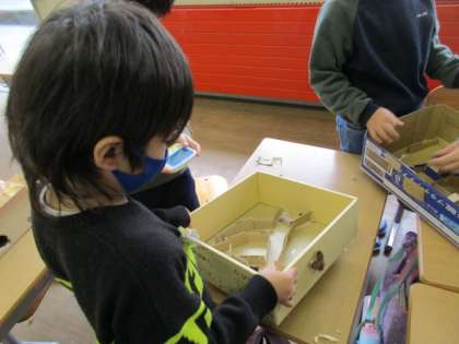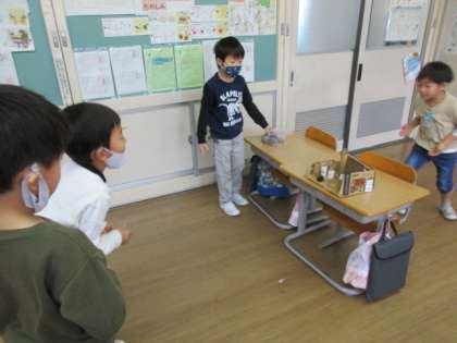あきのもので作ったおもちゃのお店も、完成に近づいてきました。今日は、お互いのお店で遊んでみるおためしタイムを設け、やってみた感想やもっと楽しいお店にするためのアドバイスを伝え合いました。さらにパワーアップしたお店になるよう、次回も頑張ります。