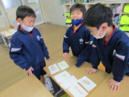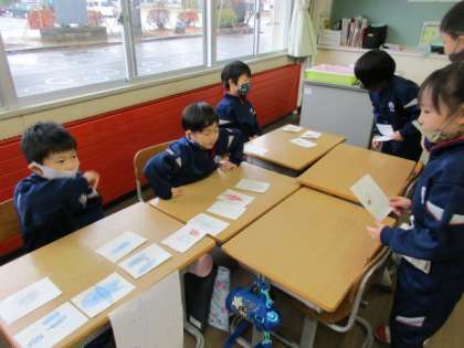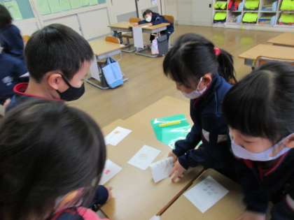 国語「ものの名まえ」の学習で、「動物」「おかし」「魚」「楽器」等の様々なお店を開きました。売り物は絵と字をかいた手作りのカードです。お店屋さんの役とお客さんの役に分かれて買い物をすると、どのお店も大繁盛であっという間に売り切れました。今日、かわいいカードを持ち帰ったので、ぜひ一緒に見て楽しんでください。