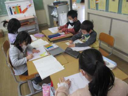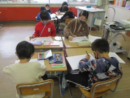 国語の学習で、お話の作者になろうをスタートしました。一人一人登場人物を考え図工の時間にそれを絵にしました。