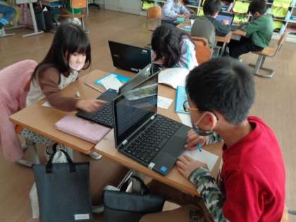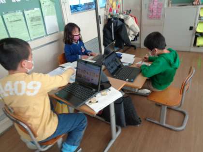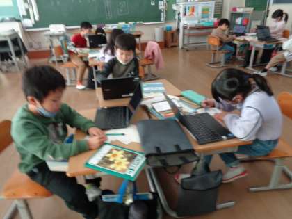 「ものの名前」の学習で、お店屋さんの準備を始めました。班で協力しながら商品カードを作成しています。