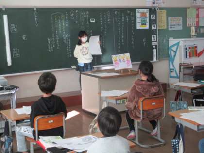 国語の学習で、物語を考えました。はじめ、中、おわりをそれぞれ考えてまとまりを意識してお話を作りました。