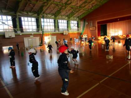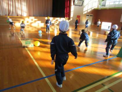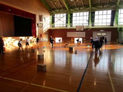 ボール蹴りの運動では、前回よりも狙いを定めてボールを蹴り、的に当てるのが上手になりました。足のどの部分で蹴ると的に当てやすいか、みんなで話し合ったことを生かして活動していました。