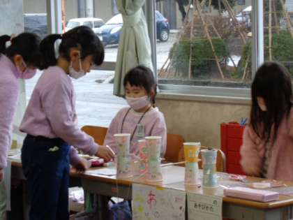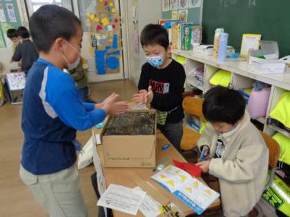金曜日に2年生さんを「秋のいろんなものショップ」にお招きします。今日は本番に向けて、お客さんとお店屋さんに分かれ、互いのおもちゃで遊んでみました。給食の時間に、招待状を届けにいきました。