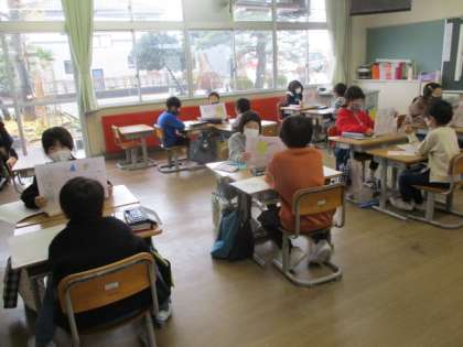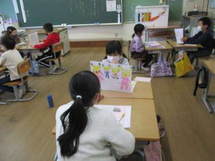 国語の学習で、「はじめ」「中」「おわり」を意識して物語を作りました。今日は、出来上がった紙芝居を読みあって感想を伝え合いました。