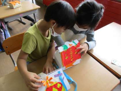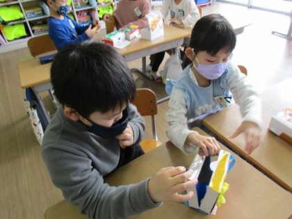 「かざってなにいれよう」の学習で作った作品をペアで鑑賞しました。友達の作品の素敵なところ、おもしろいところ、すごいところ等、よいと思ったことをたくさん伝え合いました。