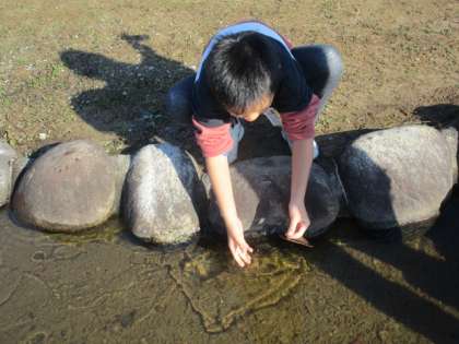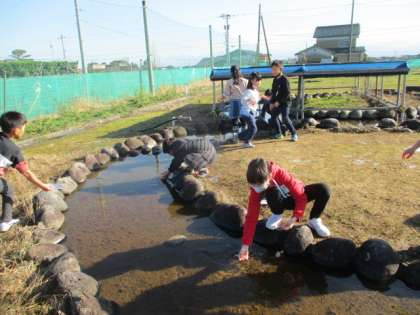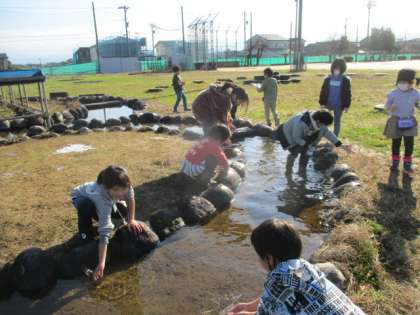なかよしタイムに神保っこワールドで氷を発見しました。池一面が凍っていて子供たちは喜んで氷をとろうと冷たい水の中に手を入れていました。