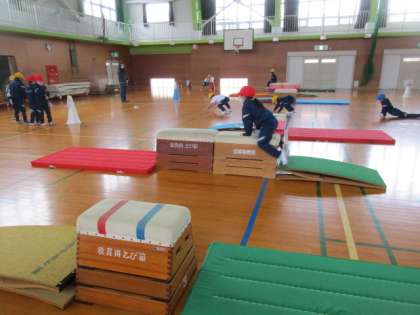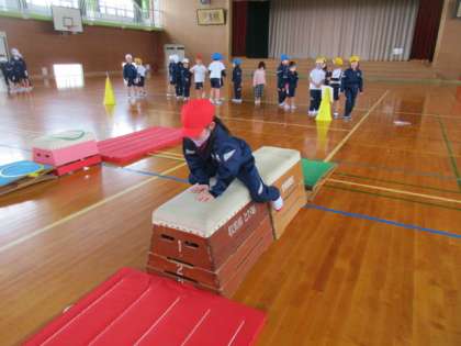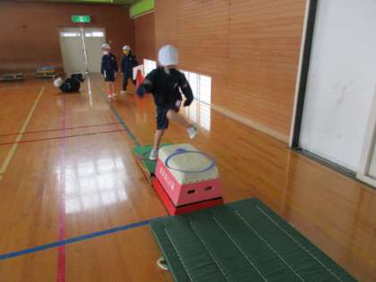 1年生では、跳び箱に跳び乗って踏み越したり、跳び箱にまたがって腕の力で進んだりと、いろいろな運動に挑戦します。今後の跳び箱運動の基礎となる大切な力を、楽しみながら身に付けていきます。