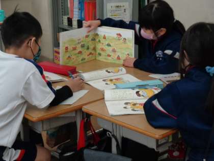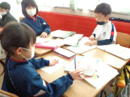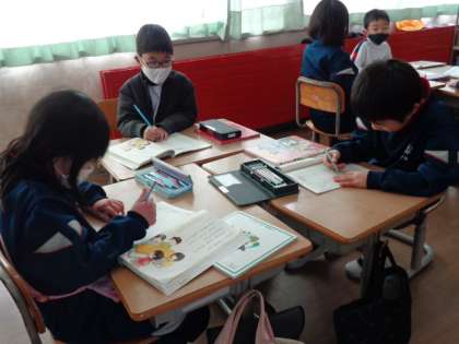 グループで自分のお気に入りの絵本を紹介する学習をしました。聞いた子が質問したり感想を伝えたりします。絵本の魅力を新たに知る機会になればと思っています。