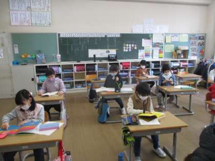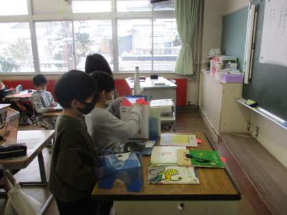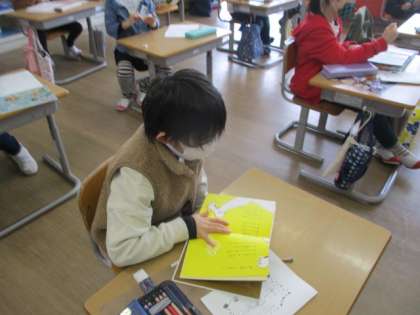 国語の学習で、詩の学習をしました。今日は教科書ににっている詩を3つ確認した後、友達にプレゼントする詩を図書室の本の中から選びました。