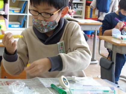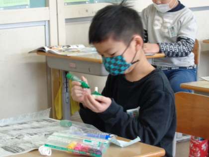 今日は一人に一つずつ木ごまを配りました。自分専用のこまです。子供たちは思い思いに模様付けを楽しんでいます。