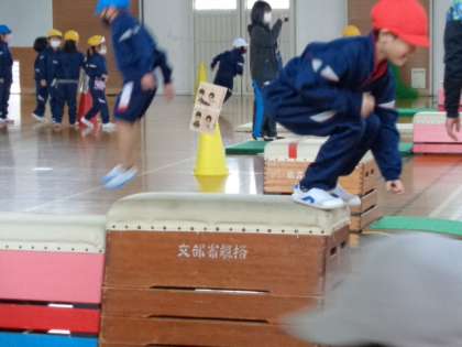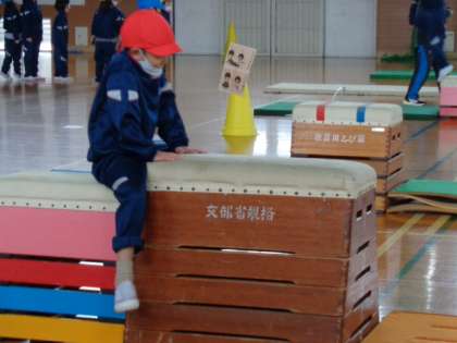 いろんな跳び方で跳び箱遊びを楽しんでいます。体の使い方もだんだん上手になってきました。