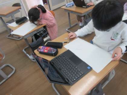 4年生 図工 公開日 2022/01/19 更新日 2022/01/19 4年生 3学期の図画工作科では、「○○している動物」をテーマに作品の下絵をかいています。自分が好きな動物をクロムブックを使って調べている子もいました。