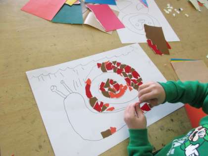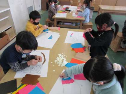 下絵を写し取った後は、8色のシールを細かくちぎって貼っていきます。「カラフルどうぶつ」になるように、色の組み合わせ方を工夫していました。